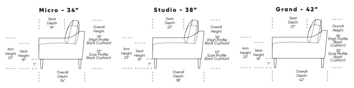 - 3 seat depth options: Grand (27" seat depth), Studio (23"), and Micro (19")